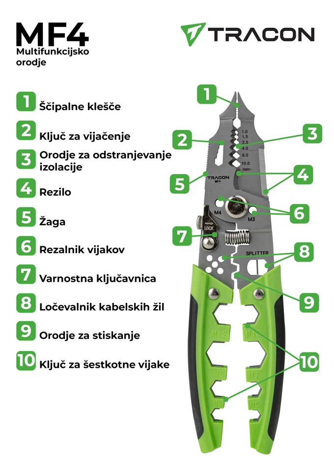 Tracon MF4 — kompaktno in vzdržljivo multifunkcijsko orodje (L=193 mm, 160 g). Ponuja večnamenske funkcije za vsakdanja popravila, enostavno za prenašanje v žepu ali torbi; idealno za dom in profesionalno uporabo. 2 leti garancije, EAN 5997374182867.