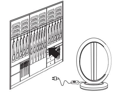 ![]() | 1. Priključite napajalni kabel na omrežje in nato vklopite stikalo v pozicijo "vklop 2. Pritisnite in za 5 sekund zadržite tipko za vklop, da zaslišite dva piska, ki naznanita vklop naprave A: Po dveh piskih lahko nastavite 15, 30 ali 60 minutno delovanje naprave. Za to imate na razpolago 5 sekund časa. Nastavitev zakasnitve vklopa naznanja neprestano piskanje, ki traja 15 sekund. Toliko časa imate, da zapustite prostor. Po preteku 15 sekund se naprava za test vklopi in takoj izklopi. Normalo delovanje svetilke nastopi po preteku dodatne 1 minute, kar se ponovno naznani s piskom. B: Če po vklopu v 5 sekundah ne nastavite časa zakasnitve vklopa, se bo svetilka po 15 sekundni zakasnitvi vklopila za čas delovanja 60 minut.