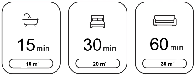 Pazite na to, da se v prostoru s svetilko ne bodo nahajali ljudje, živali ali rastline! UVC svetilka je najučinkovitejša s sterilizacijo v območju 1 m, zato priporočamo njeno postavitev blizu površine, ki jo želite sterilizirati. | Za učinkovito sterilizacijo priporočamo sterilizacijo čistega prostora. V temperaturnem območju pod 20 °C in nad 40 °C je priporočljivo, da se čas delovanja svetilke podaljša za 15 minut.